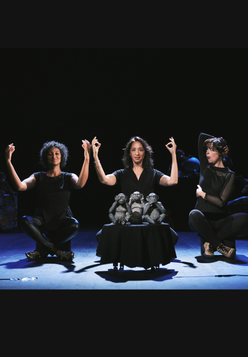 Trois amies butinent dans un vide-grenier, l’humeur légère, quand tout à coup elles découvrent trois singes en bois, familiers et énigmatiques. Une version tout en complicité et en harmonie vocale autour du mythe des Trois Singes.
